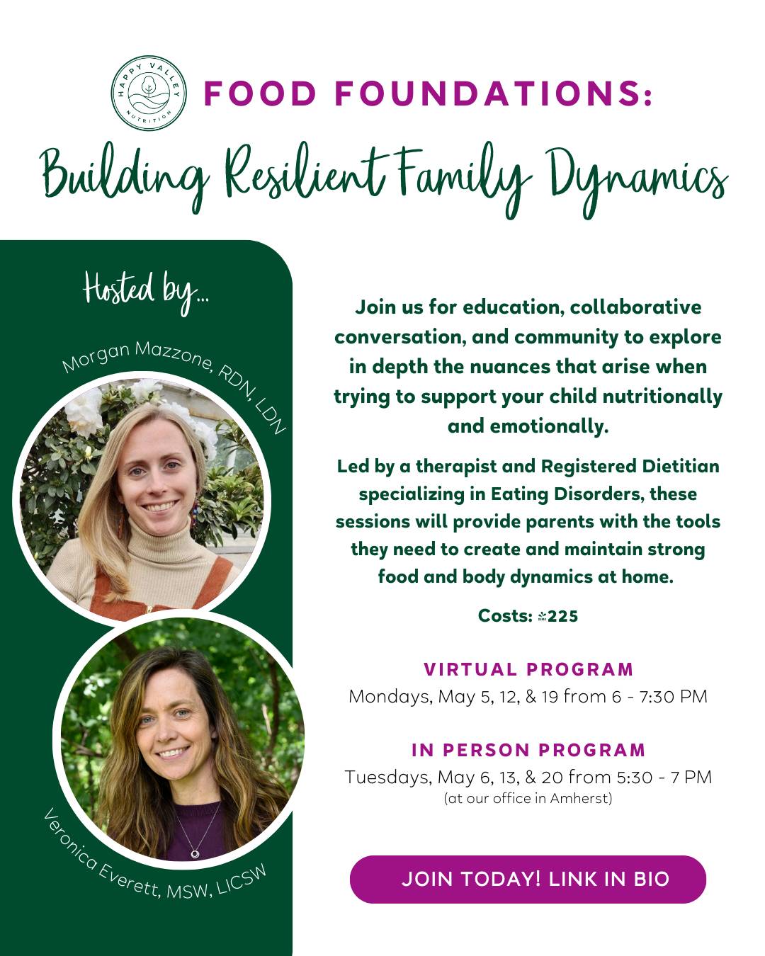 Led by a therapist and Registered Dietitian specializing in Eating Disorders, these sessions will provide parents with the tools they need to create and maintain strong food and body dynamics at home. Join us for education, collaborative conversation, and community to explore in depth the nuances that arise when trying to support your child nutritionally and emotionally.